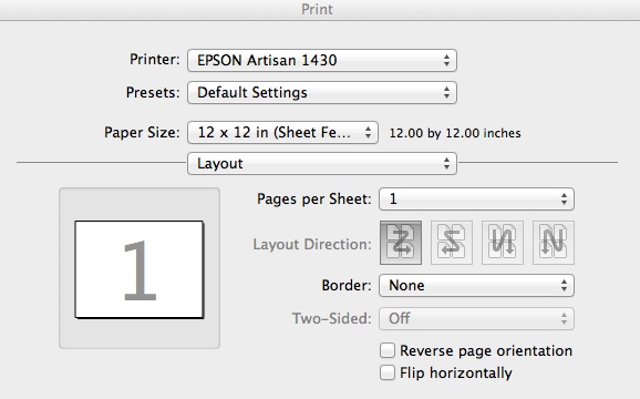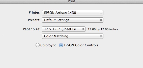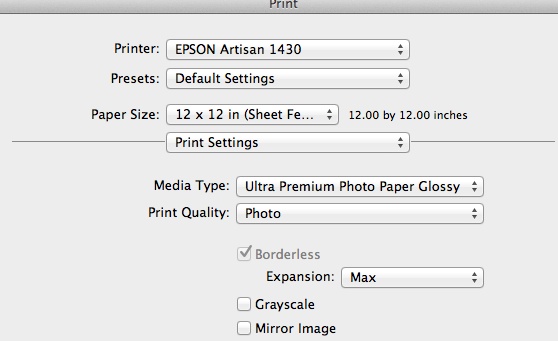 5. These are now the Epson Artisan 1430 settings. The Paper Size should be 12×12 and Border is None.