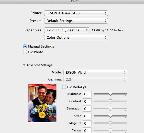 4. Hit Print and the settings for the Epson Artisan 1430 will come up.
