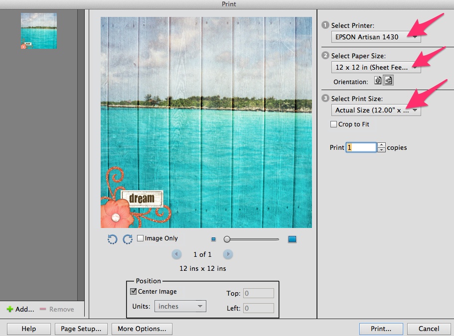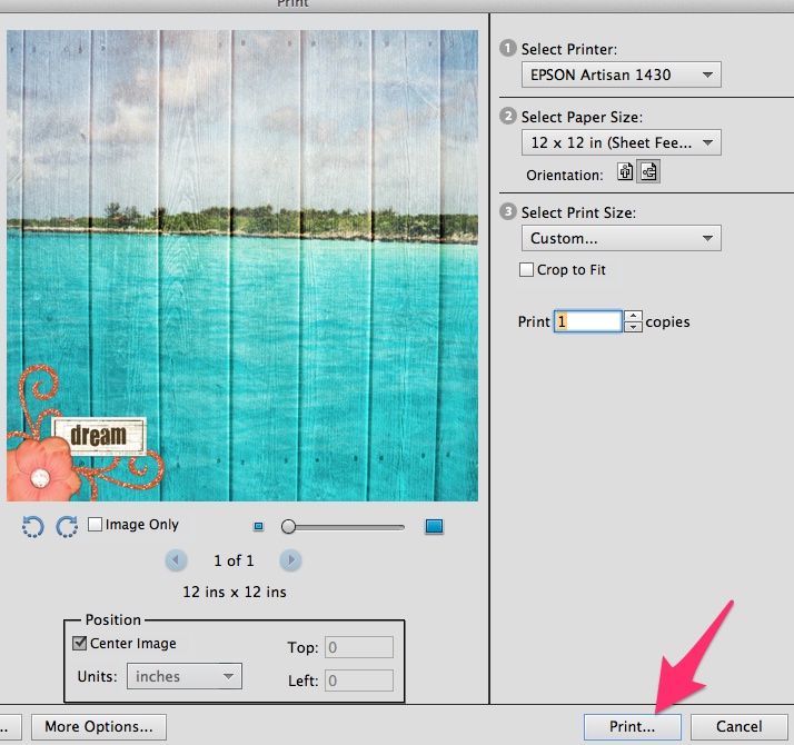 9. Next, hit Print. This will send the file to your Epson Artisan 1430 and you are now printing 12×12 digital scrapbook pages.