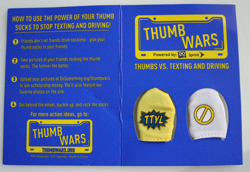 Sprint and DoSomething.org have teamed together for the Thumb Wars campaign to help prevent young people from texting while driving. Teens can sign up to receive two pairs of the thumb socks. Share one pair with friend they know who texts while driving. Take a photo (with your new LG G4 camera) and send it back to DoSomething.org.